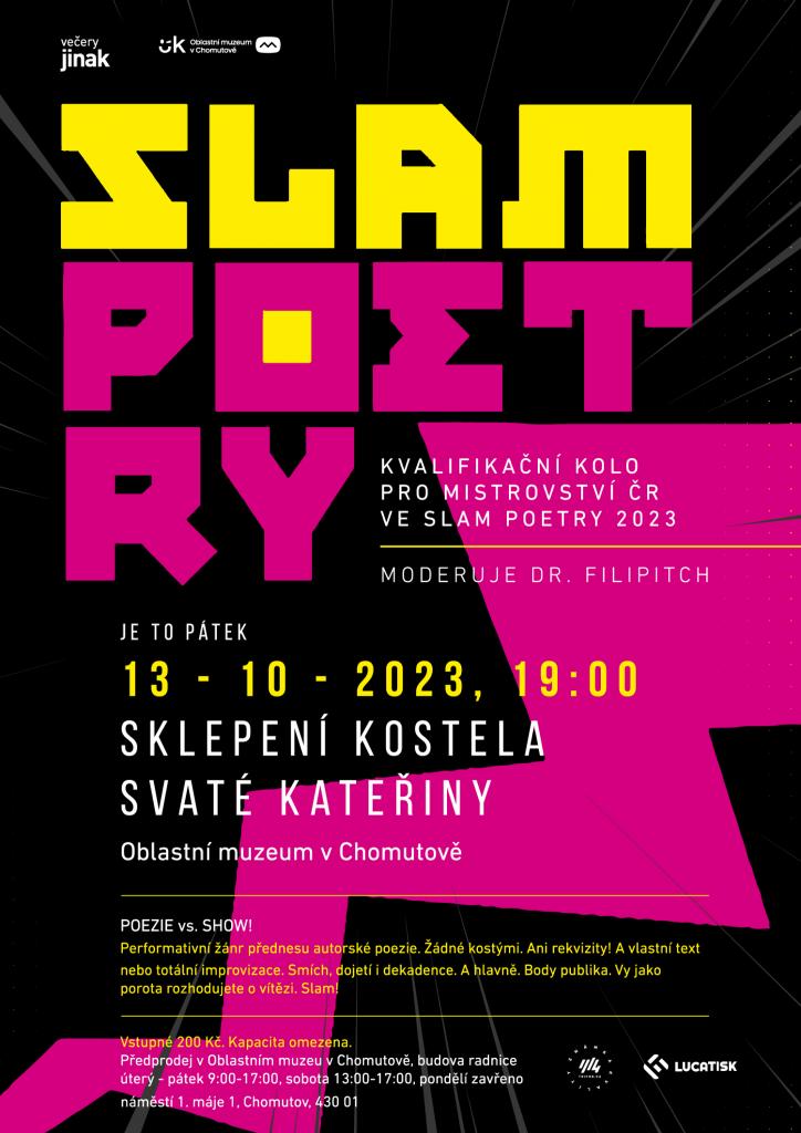 V pátek 13. října od 19:00 proběhne v Chomutově kvalifikační kolo na Mistrovství republiky ve Slam Poetry za Ústecký kraj. Večery jinak, pořadatelé akce, spojili síly s Oblastním muzeem v Chomutově a vybrali pro takovou příležitost netradiční prostory ve sklepení kostela svaté Kateřiny.