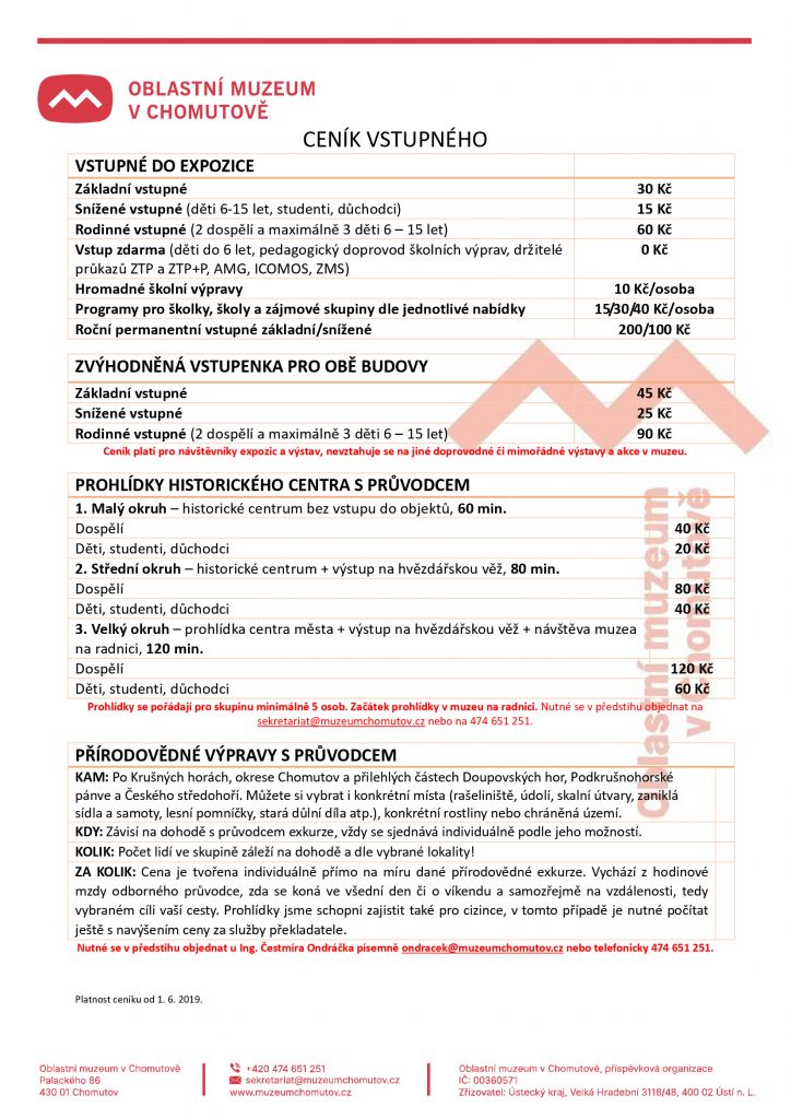 Od 1.6.2019 máme nový ceník, opět rozšiřujeme nabídku návštěvníkům, tentokrát o exkurze do přírody s erudovaným průvodcem. Exkurze jsou určeny nejen pro zvídavé Chomutovany, nadšené turisty, ale také pro další zájmové skupiny i cizince.