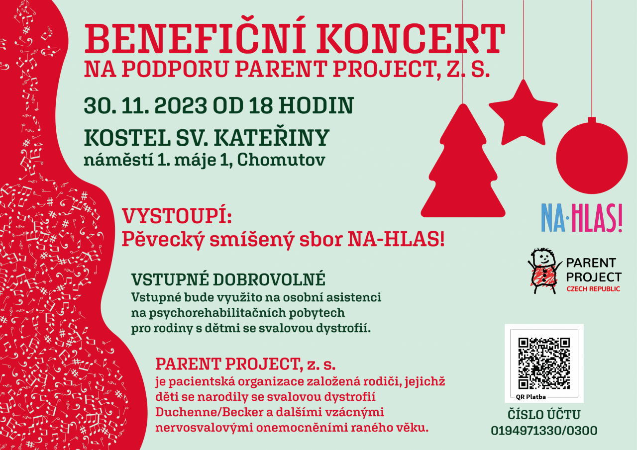 Sérii vánočních koncertů v kostele sv. Kateřiny zahájí ve čtvrtek 30. listopadu od 18 hodin benefiční koncert pěveckého smíšeného sboru NA-HLAS! na podporu spolku Parent Project, sdružující rodiče dětí se svalovou dystrofií a dalšími nervosvalovými poruchami.