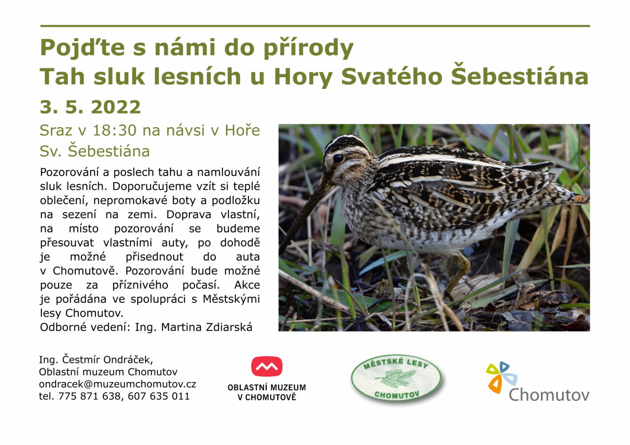 Pozorování a poslech tahu a namlouvání sluk lesních (popř. i bekasin otavních a jeřábů popelavých) v okolí Hory Sv. Šebestiána.