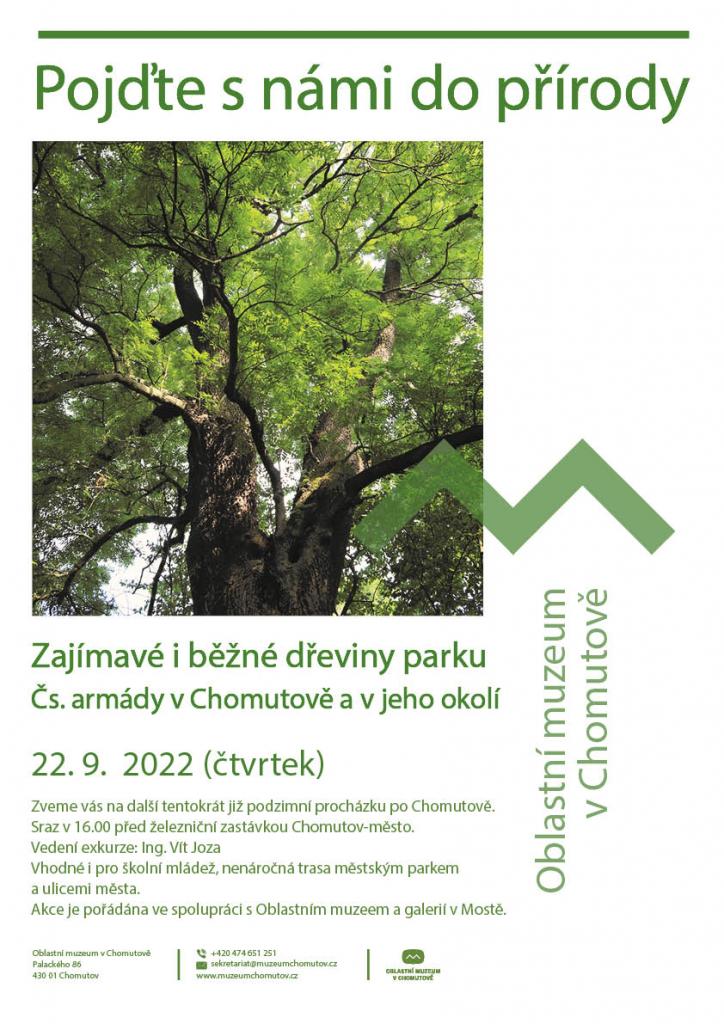 Tentokrát se podíváme na zajímavé i běžné dřeviny parku Čs. armády v Chomutově a v jeho okolí. Procházka se bude konat ve čtvrtek 22. 9. 2022. Sraz bude před železniční zastávkou Chomutov-město v 16 hodin a vedení exkurze zajistí Ing. Vít Joza.