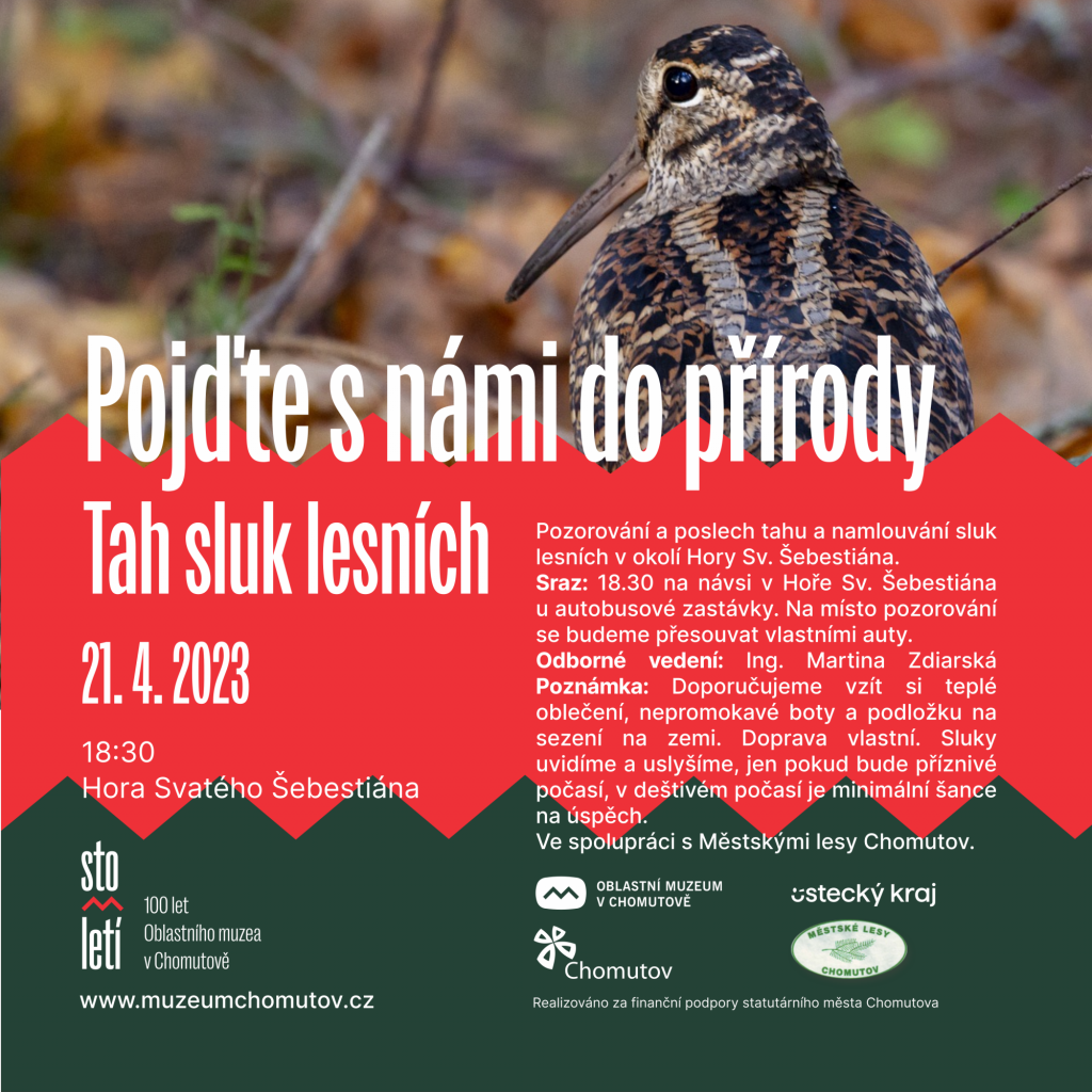 Pozorování a poslech tahu a namlouvání sluk lesních (popř. i bekasin otavních a jeřábů popelavých) v okolí Hory Sv. Šebestiána. Akce je pořádána ve spolupráci s Městskými lesy Chomutov.