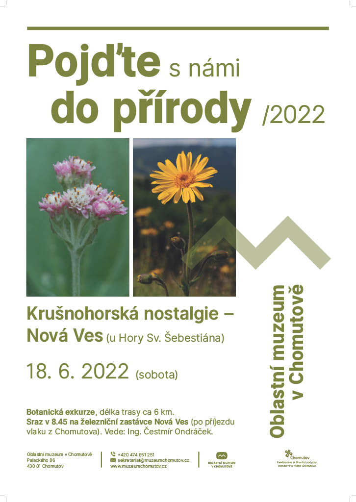 18. 6. (So) Krušnohorská nostalgie – Nová Ves (u Hory Sv. Šebestiána). Botanická exkurze (rosnatka okrouhlolistá, zdrojovka hladkosemenná, prha arnika, vachta trojlistá, prstnatec májový a plamatý, kociánek dvoudomý aj.). Louky, lesy, odvaly, prameniště, smilkové louky, vřesoviště.
