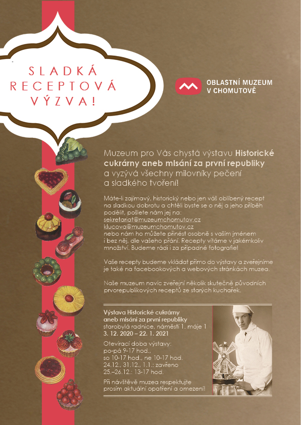 Muzeum pro vás chystá výstavu Historické cukrárny a proto vyzýváme všechny milovníky pečení, sladkého tvoření i ochutnavačů - máte-li zajímavý, historický nebo jen váš oblíbený recept na sladkou dobrotu a chtěli byste se o něj a jeho příběh podělit, pošlete nám jej na naši emailovou adresu: sekretariat@muzeumchomutov.cz nebo nám jej můžete odnést do poštovní schránky na adrese Palackého 86 a až nám to situace dovolí a budeme moci pro vás výstavu otevřít budeme rádi, pokud nám recepty přinesete přímo do výstavy, kde je připravena nástěnka "Sladká receptárna".